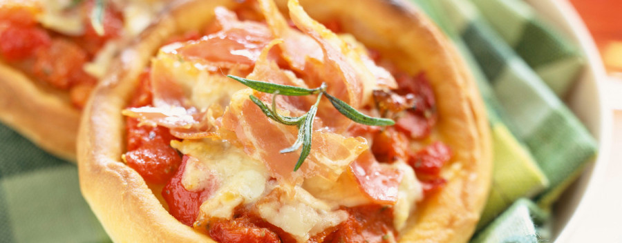 Resulta muy fácil cocinar comida rápida y sana con esta receta de minipizza: base de pizza con salsa de tomate y beicon. Un tentempié suculento en un santiamén.